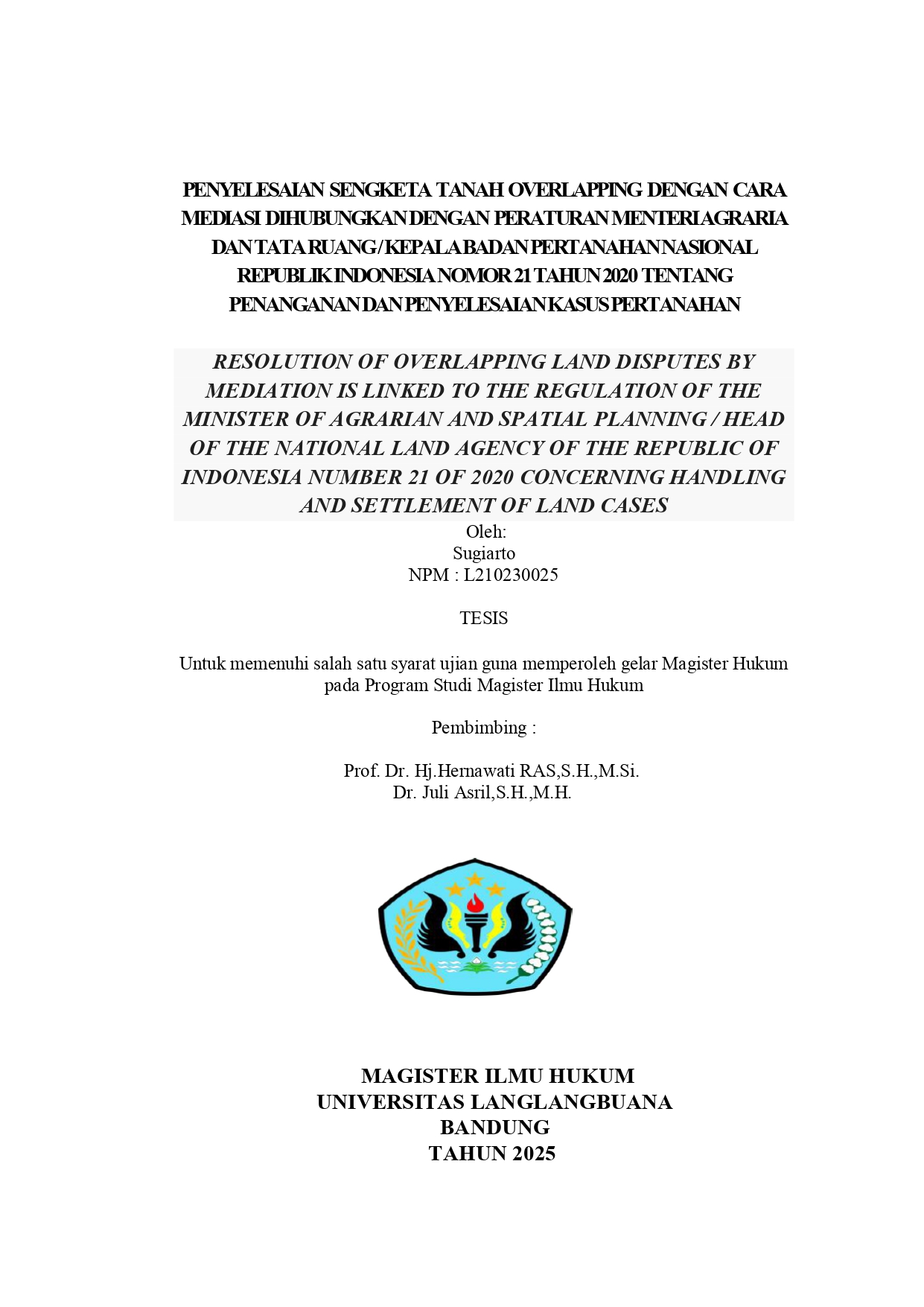 PENYELESAIAN SENGKETA TANAH OVERLAPPING DENGAN CARA MEDIASI DIHUBUNGKAN DENGAN PERATURAN MENTERI AGRARIA DAN TATA RUANG / KEPALA BADAN PERTANAHAN NASIONAL REPUBLIK INDONESIA NOMOR 21 TAHUN 2020 TENTANG PENANGANAN DAN PENYELESAIAN KASUS PERTANAHAN